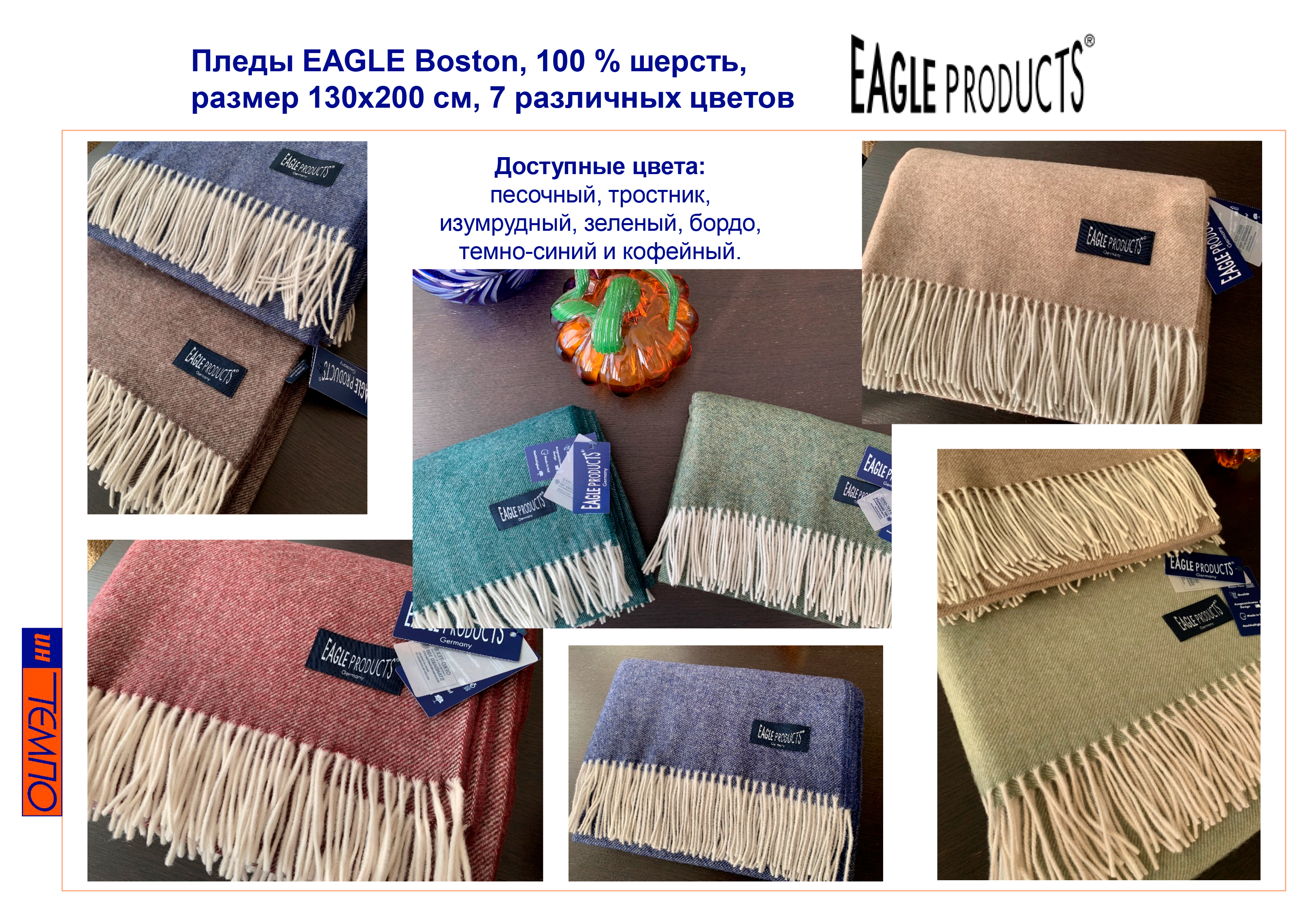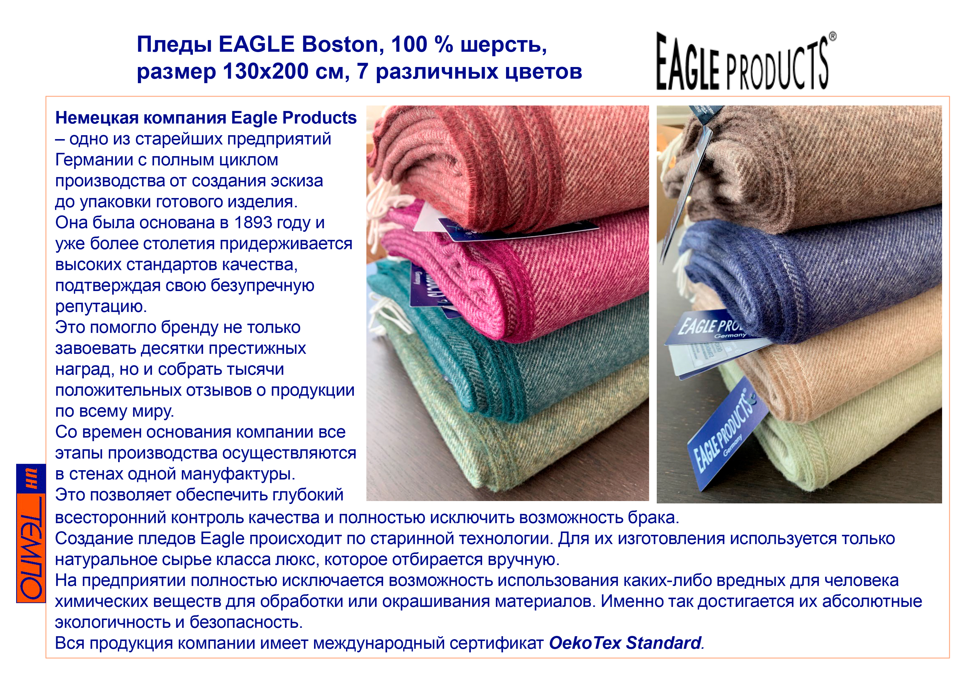 Textile / EAGLE PRODUCTS (Немецкий текстиль). Доставка в течение дня. Немецкие палантины компании Eagle, изготовленные из высококачественной шерсти - престижный женский корпоративный подарокООО Интемпо является прямым и официальным поставщиком немецких палантинов EAGLE на российском рынке. ООО "Интемпо" - импортер, участник внешнеэкономической деятельности. Компания EAGLE Products была основана в 1893 году немецким предпринимателем Францем Бартом. С 1914 года компания стала специализироваться на производстве шарфов, палантинов и пледов из шерсти и других натуральных волокон. Продукция EAGLE - первоклассные модные товары и аксессуары для дома из натуральных материалов. Производство расположено в северной части Баварии, где текстильная промышленность имеет давние традиции, а словам "Made in Germany" придается большое значение.